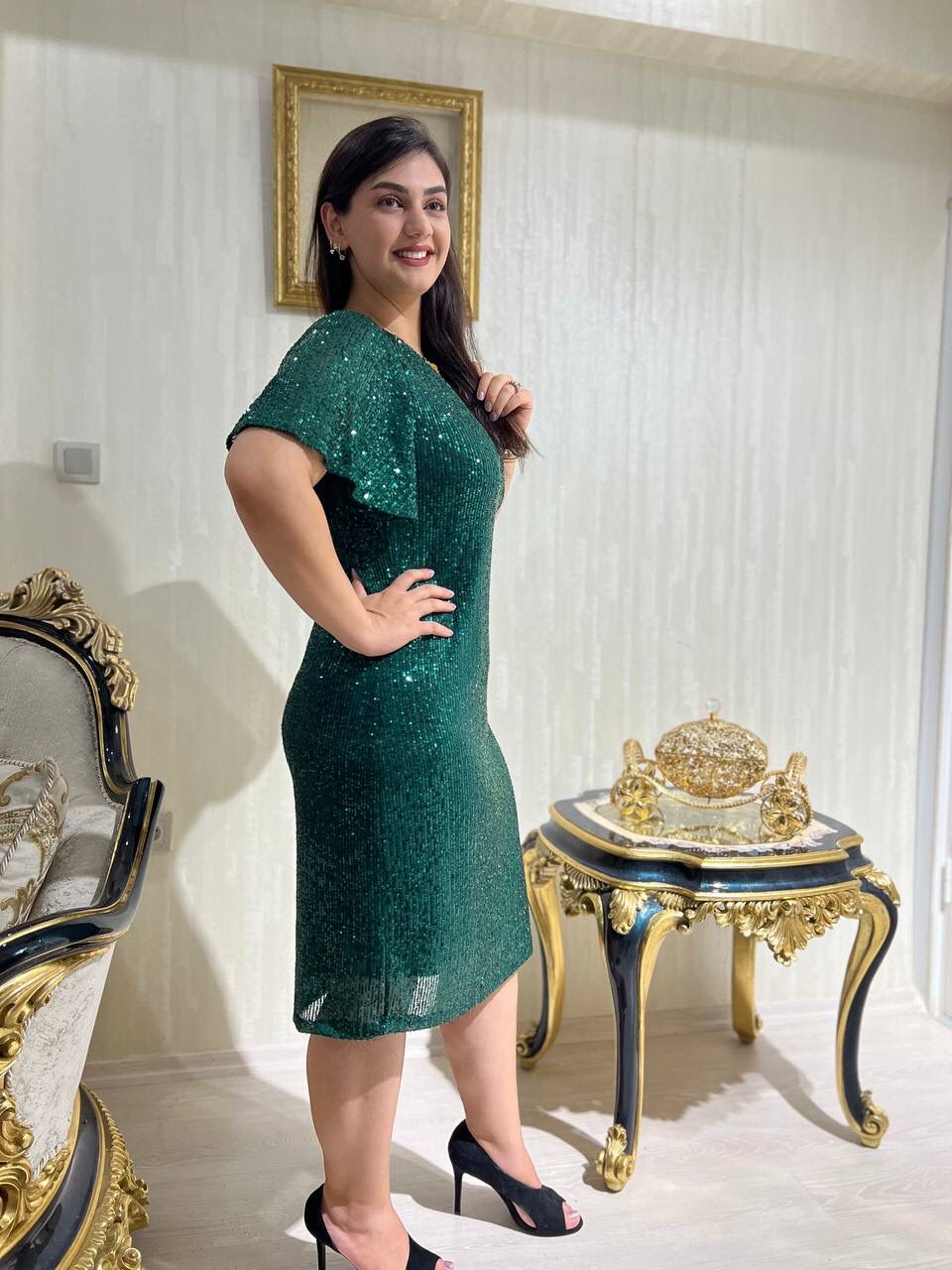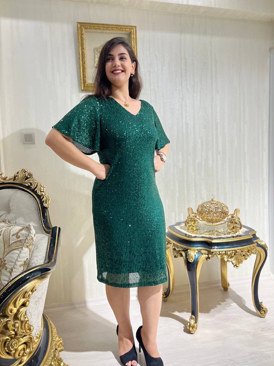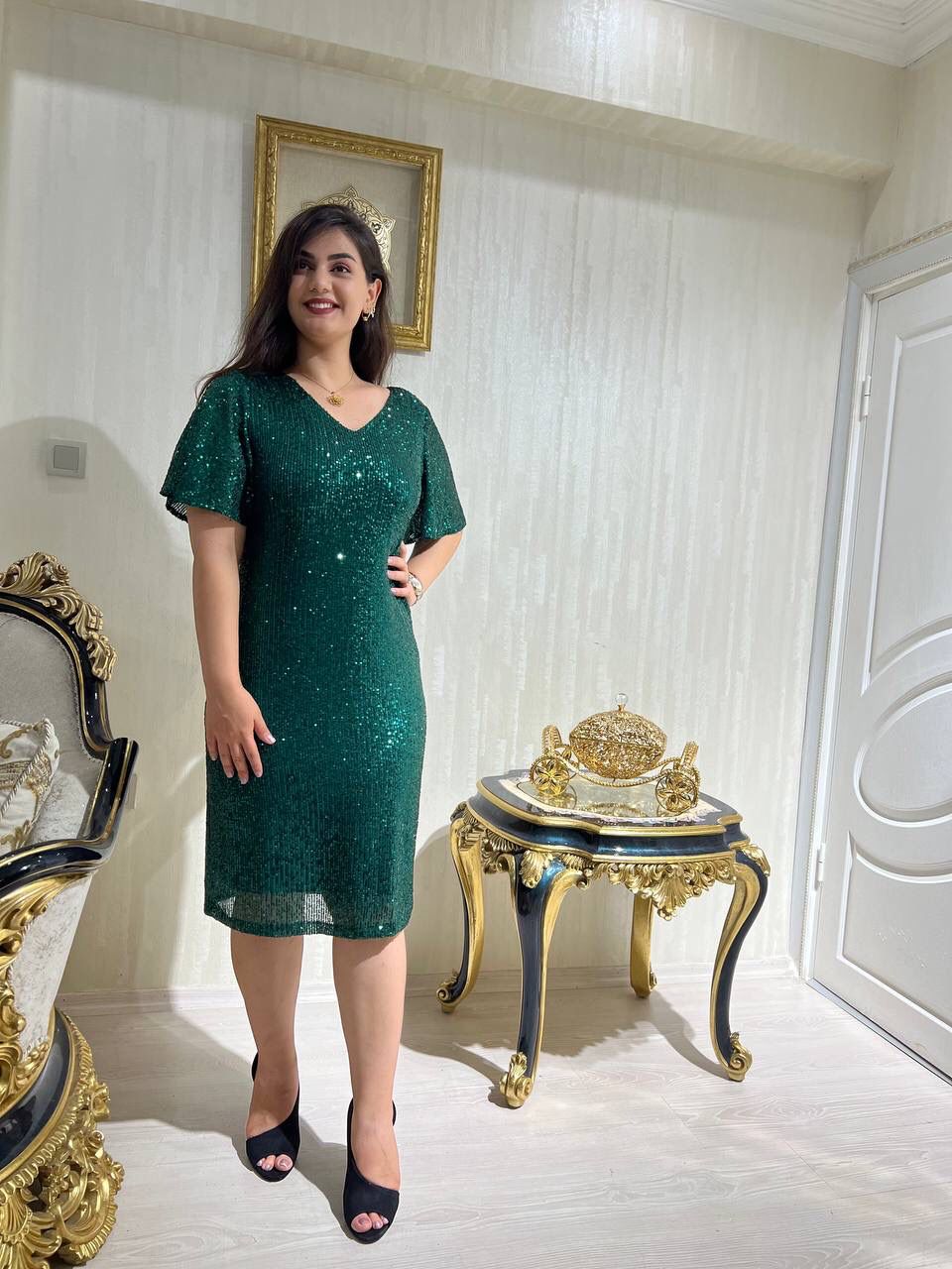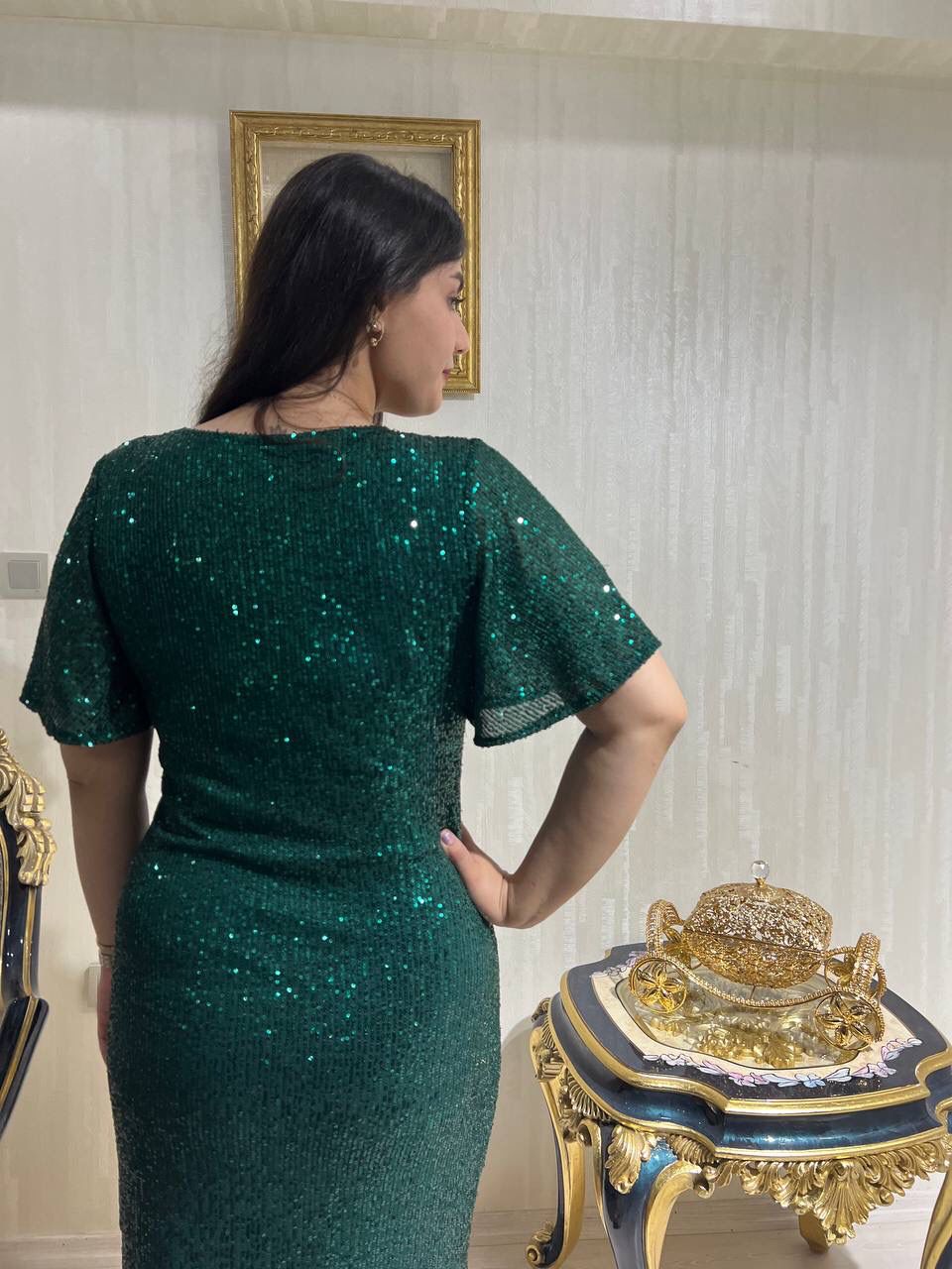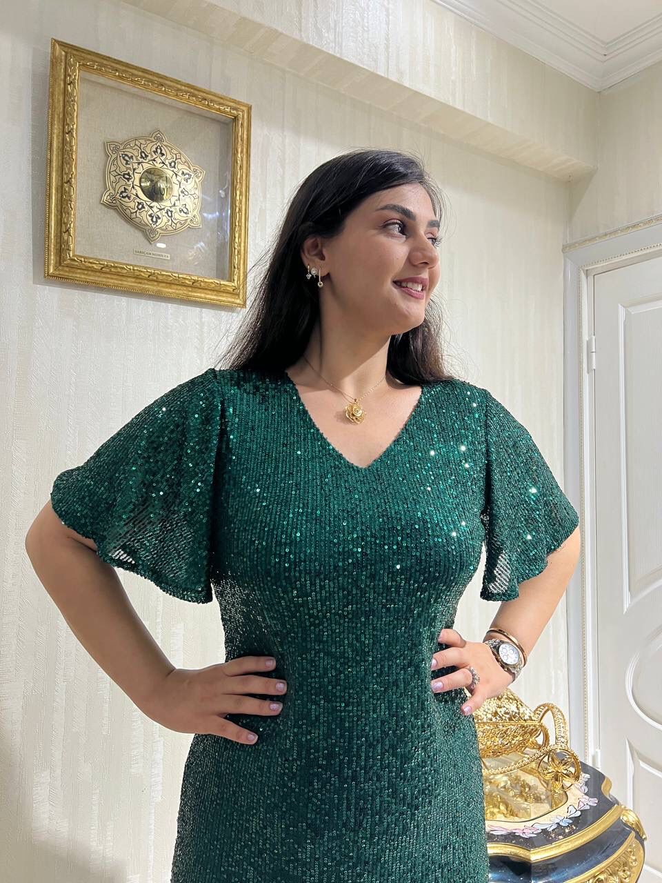 Büyük Beden Yeşil Ful Payetli Midi Boy Abiye Elbise
